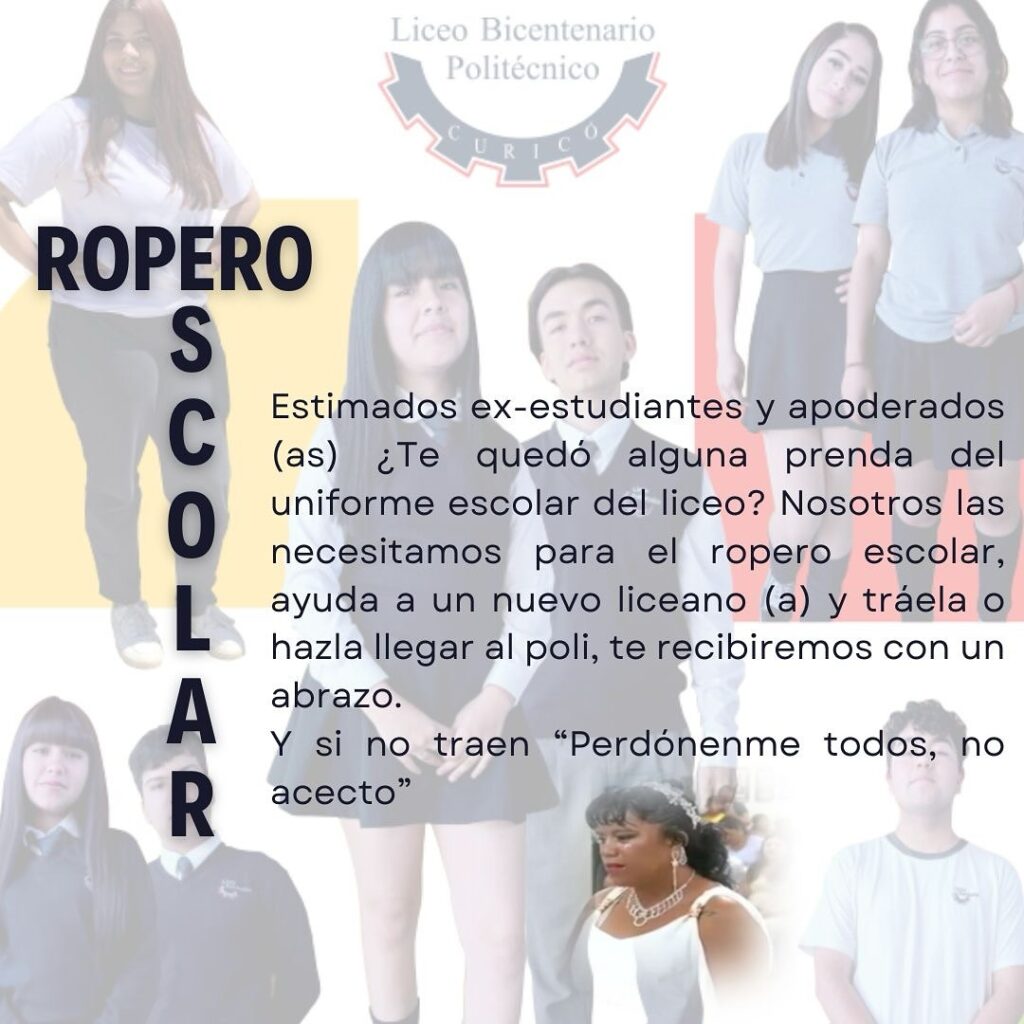 Atención ex alumnos (a) estamos en campaña del ropero escolar, si tienes alguna prenda hazla llegar a nuestro establecimiento @liceobicentenariopoliteccurico, te esperamos!!!