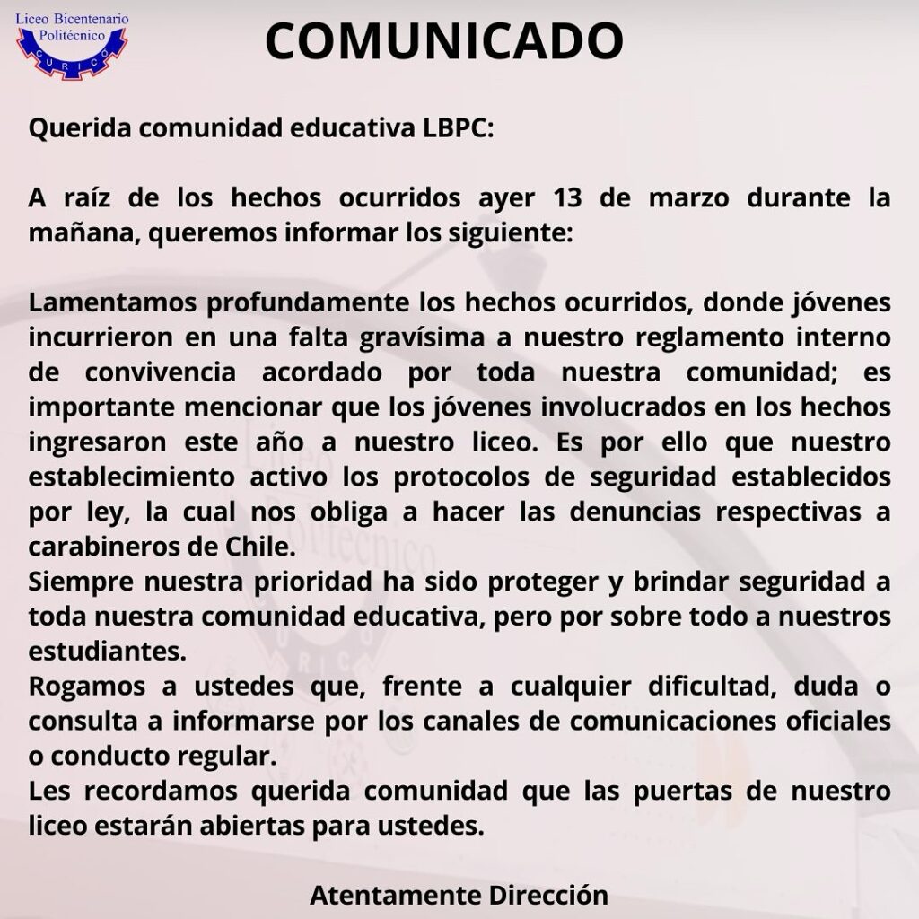 Querida comunidad educativa LBPC: A raíz de los hechos ocurridos ayer 13 de marzo durante la mañana, queremos informar los siguiente: Lamentamos profundamente los hechos ocurridos, donde jóvenes incurrieron en una falta gravísima a nuestro reglamento interno de convivencia acordado por toda nuestra comunidad; es importante mencionar que los jóvenes involucrados en los hechos ingresaron […]