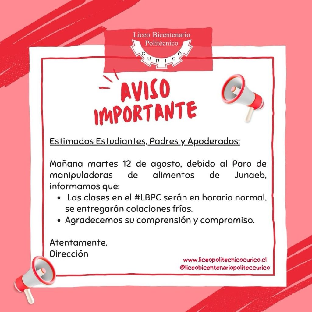 Estimados Estudiantes, Padres y Apoderados:El día martes 12 de agosto, debido al Paro de manipuladoras de alimentos de Junaeb,informamos que:• Las clases en el #LBPC serán en horario normal, se entregarán colaciones frías.• Agradecemos su comprensión y compromiso.Atentamente, Dirección