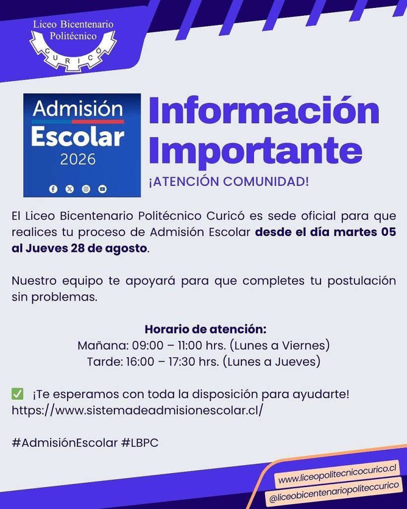 El Liceo Bicentenario Politécnico Curicó es sede oficial para que realices tu proceso de Admisión Escolar desde el día martes 05 al Jueves 28 de agosto. Nuestro equipo te apoyará para que completes tu postulación sin problemas. Horario de atención: Mañana: 09:00 – 11:00 hrs. (Lunes a Viernes) Tarde: 16:00 – 17:30 hrs. (Lunes a […]