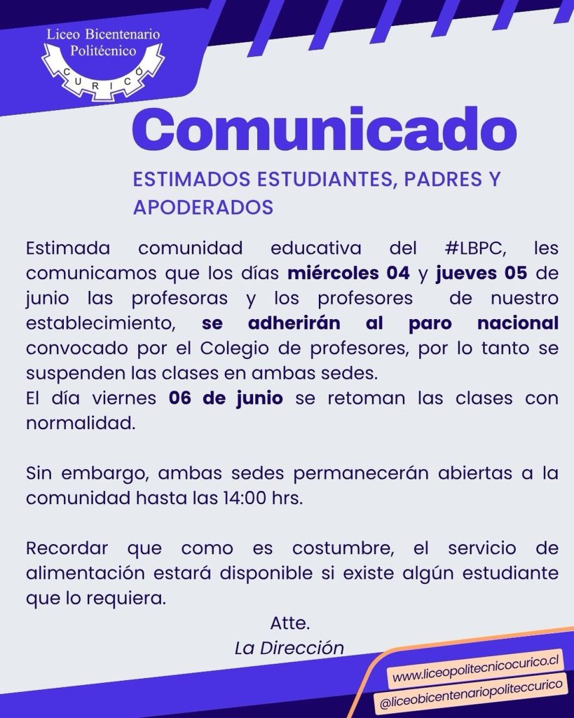 Estimada comunidad educativa del #LBPC, les comunicamos que los días miércoles 04 y jueves 05 de junio las profesoras y los profesores de nuestro establecimiento, se adherirán al paro nacional convocado por el Colegio de profesores, por lo tanto se suspenden las clases en ambas sedes.El día viernes 06 de junio se retoman las clases con […]