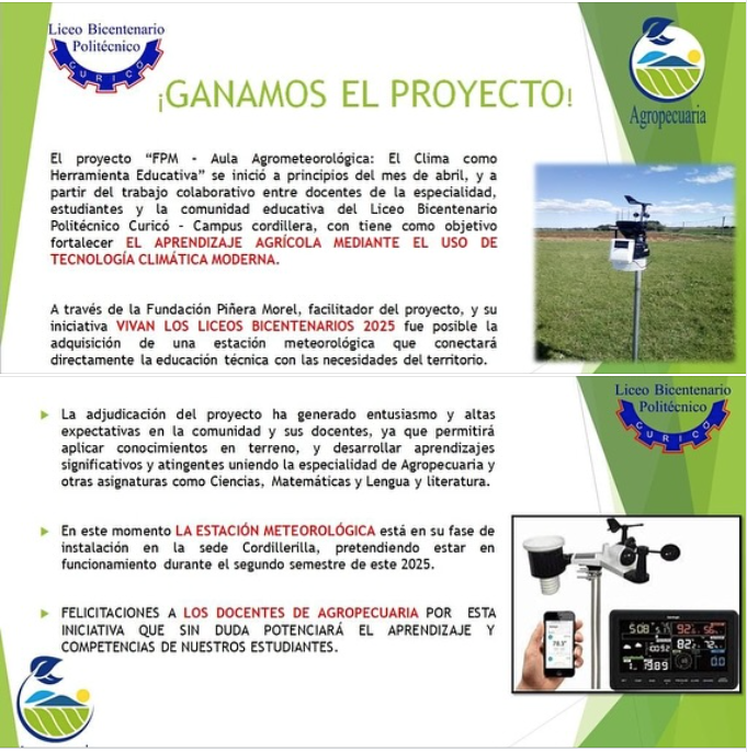 “Docentes de la Especialidad de Agropecuaria, del Campus Cordillera, adjudicaron un proyecto con el tendremos muy pronto una Estación Meteorológica. Sí, como lo lees. Con ella se desarrollará trabajo colaborativo entre docentes con el fin de fortalecer EL APRENDIZAJE AGRÍCOLA MEDIANTE EL USO DE TECNOLOGÍA CLIMÁTICA MODERNA. Nuestros estudiantes podrán aprender a leer datos desde […]