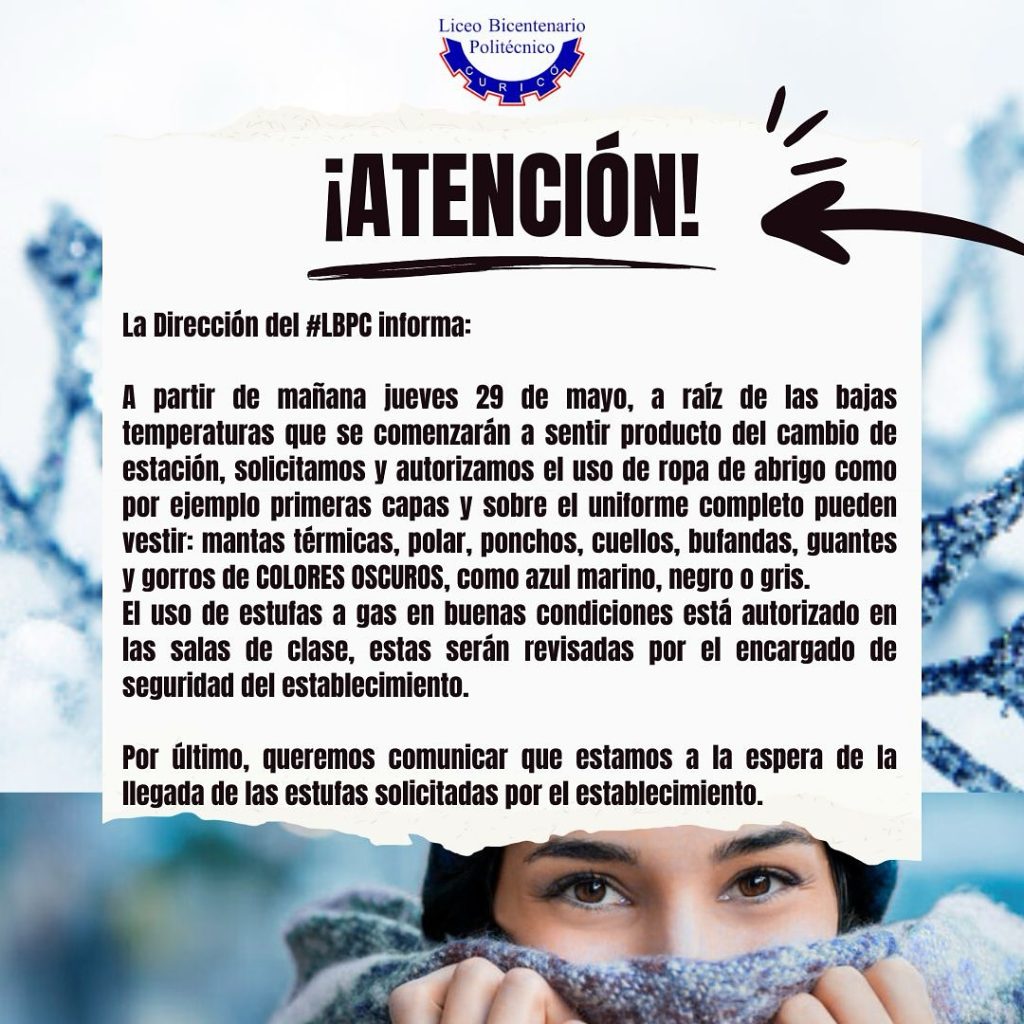 CIRCULAR La Dirección del #LBPC informa: A partir de mañana jueves 29 de mayo, a raíz de las bajas temperaturas que se comenzarán a sentir producto del cambio de estación, solicitamos y autorizamos el uso de ropa de abrigo como por ejemplo primeras capas y sobre el uniforme completo pueden vestir: mantas térmicas, polar, ponchos, […]
