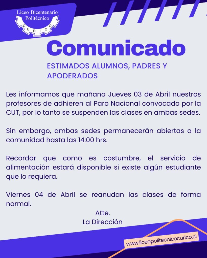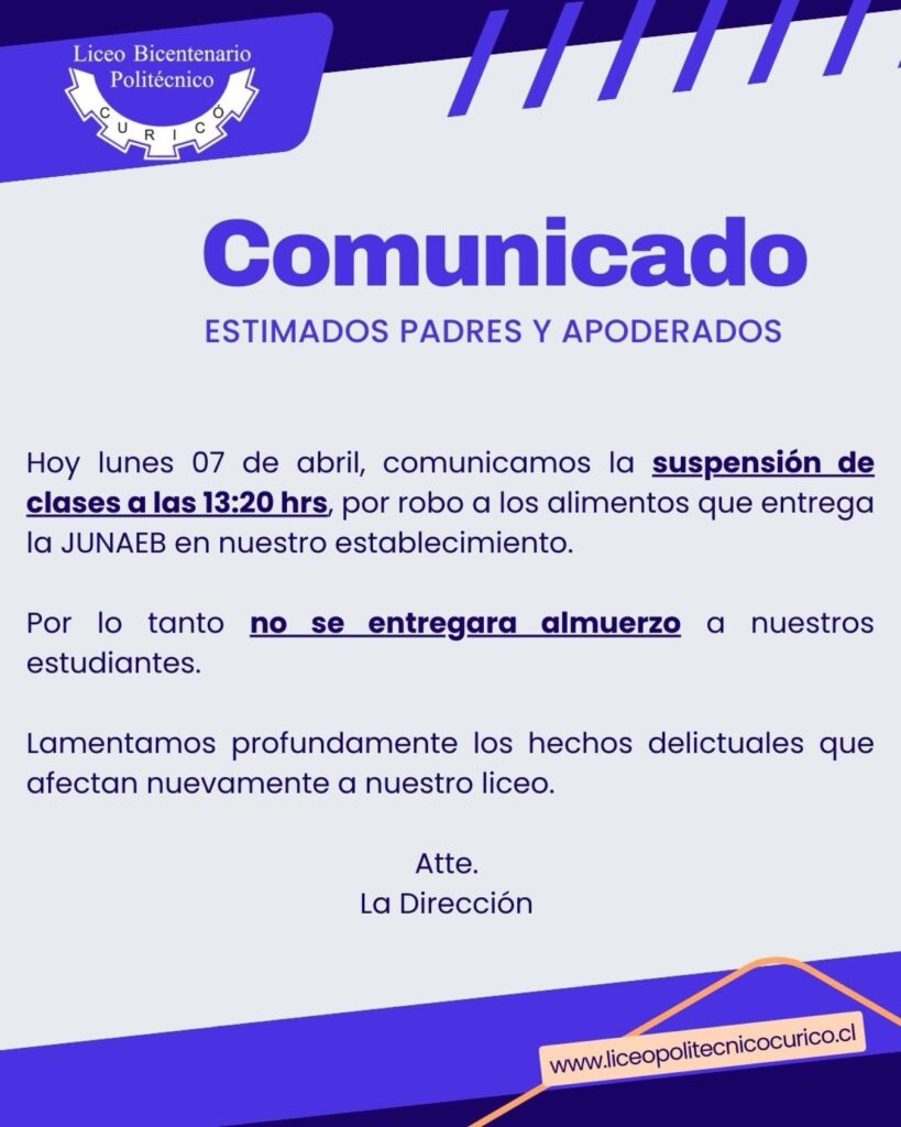 Hoy lunes 07 de abril, comunicamos la suspensión de clases a las 13:20 hrs, por robo a los alimentos que entrega la JUNAEB en nuestro establecimiento. Por lo tanto no se entregara almuerzo a nuestros estudiantes. Lamentamos profundamente los hechos delictuales que afectan nuevamente a nuestro liceo. Atte. La Dirección