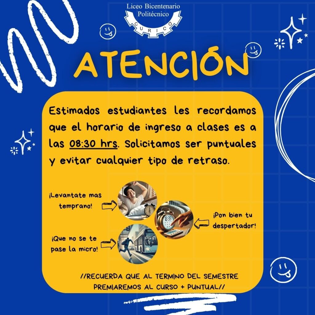 Estimados estudiantes les recordamos que el horario de ingreso a clases es a las 08:30 hrs. Solicitamos ser puntuales y evitar cualquier tipo de retraso. //RECUERDA QUE AL TERMINO DEL SEMESTRE PREMIAREMOS AL CURSO + PUNTUAL//