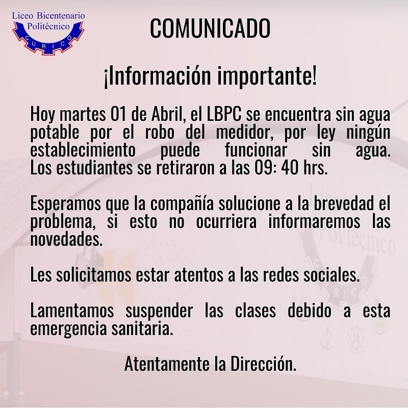COMUNICADO ¡Información importante! Hoy martes 01 de Abril, el LBPC se encuentra sin agua potable por el robo del medidor, por ley ningún establecimiento puede funcionar agua. Los estudiantes se retiraron a las 09: 40 hrs. Esperamos que la compañía solucione a la brevedad el problema, si esto no ocurriera informaremos las novedades. Les solicitamos […]
