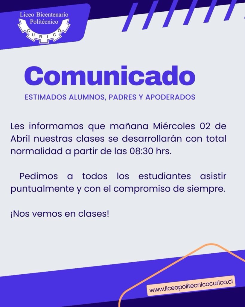 Les informamos que mañana Miércoles 02 de Abril nuestras clases se desarrollarán con total normalidad a partir de las 08:30 hrs. Pedimos a todos los estudiantes asistir puntualmente y con el compromiso de siempre. ¡Nos vemos en clases!