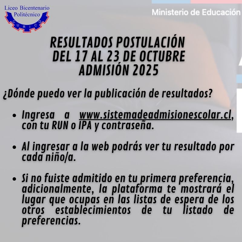 Ya están los resultados de la postulación a la admisión 2025 recuerda que la fecha es del 17 al 23 de octubre, ingresando a